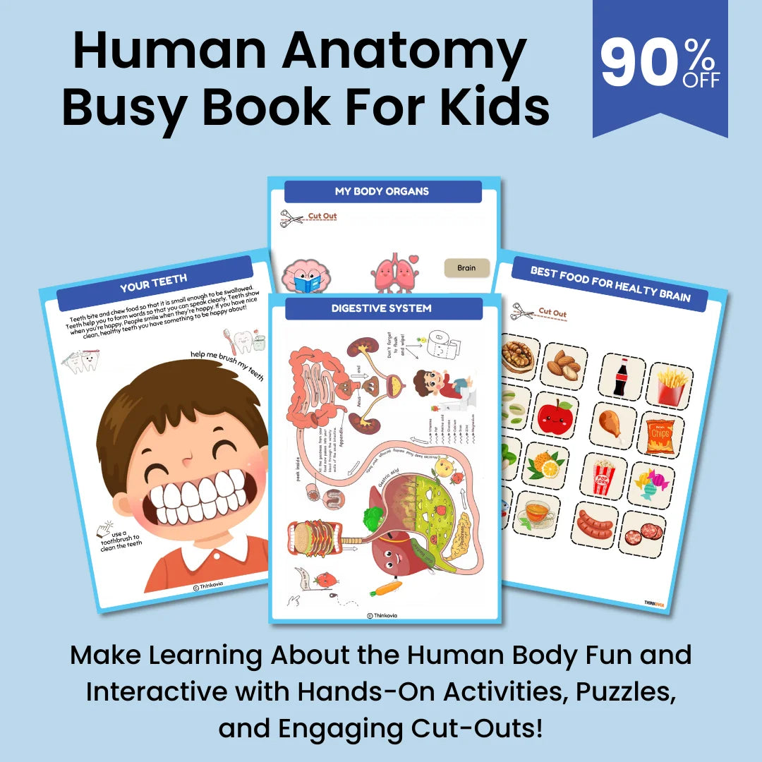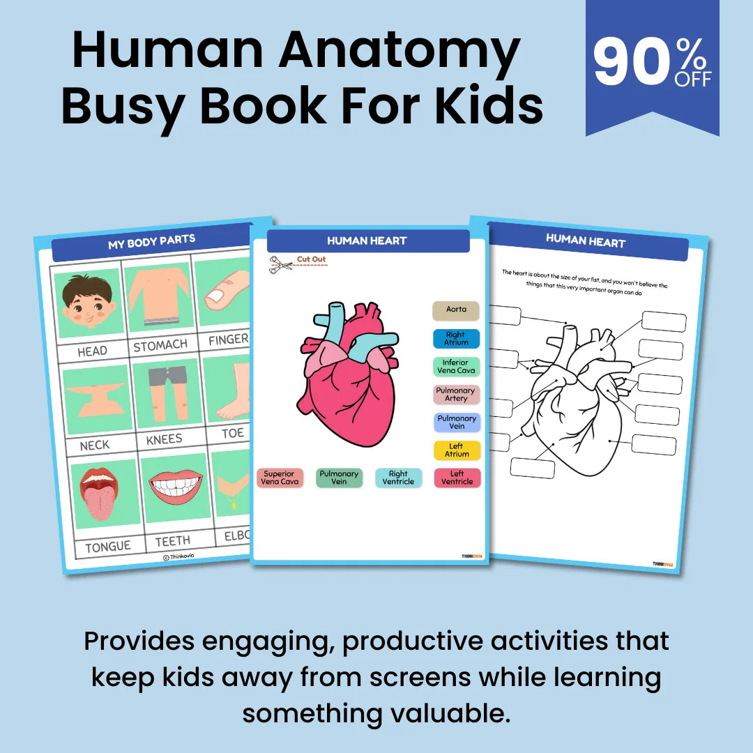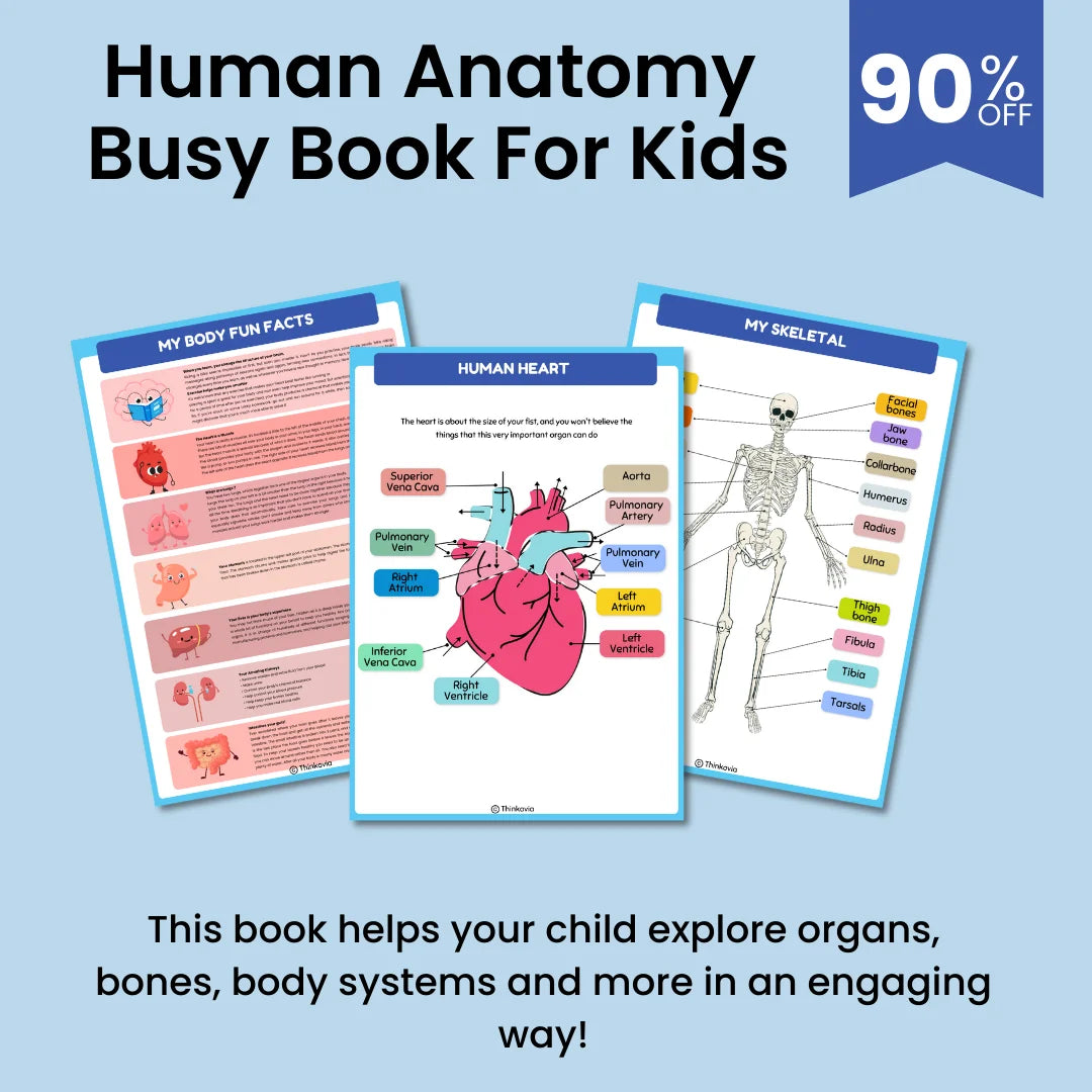 This Human Anatomy Busy Book is a workbook designed for preschoolers and early learners. With cut-and-paste activities, fun facts, and interactive worksheets, kids will explore the organs, skeleton, digestive system, heart, teeth, brain, and more in a playful way.